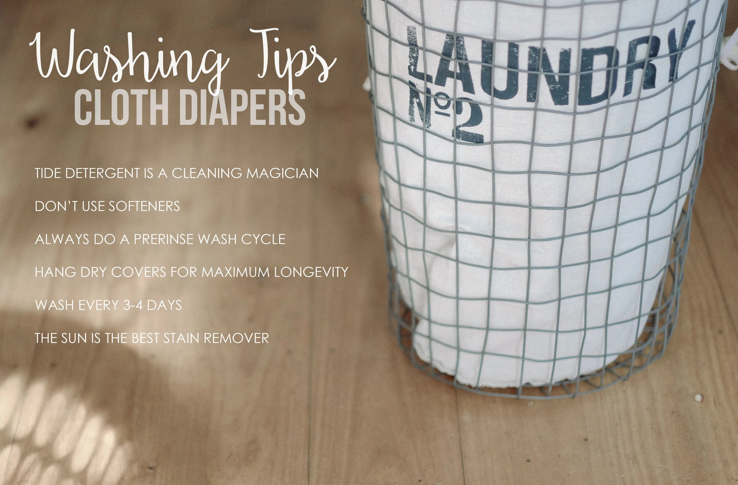 1. PreRinse Cycle (20 minutes with no detergent) 2. Normal Cycle on Hot with an extra prewash. I use Tide Liquid Detergent (Approx. 50 minutes). Then to save energy costs AND for your diapers to last longer, 3. I hang dry the inserts and diaper covers. It takes about 2 hours for the covers to dry and 4-5 hours for the inserts to dry which is why I do the load at night and stuff them in the morning. If there are any diapers that still have stains, I will put them out in the sun for a few hours!